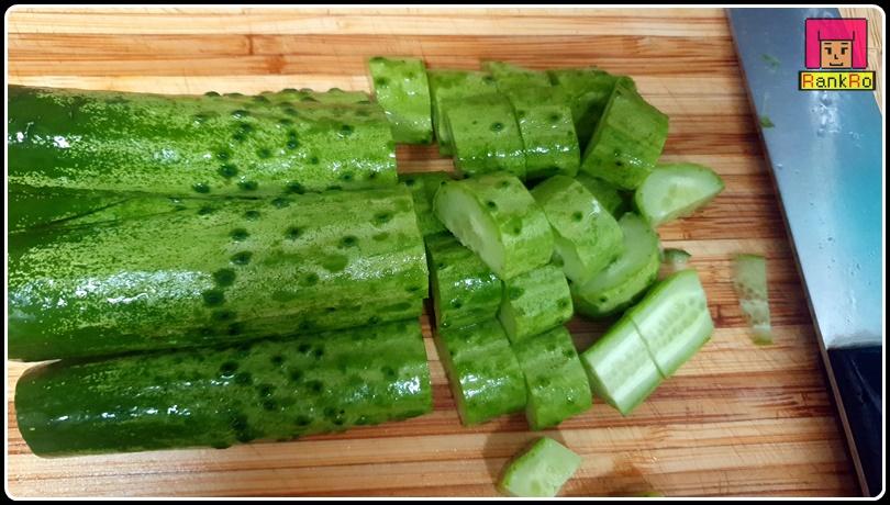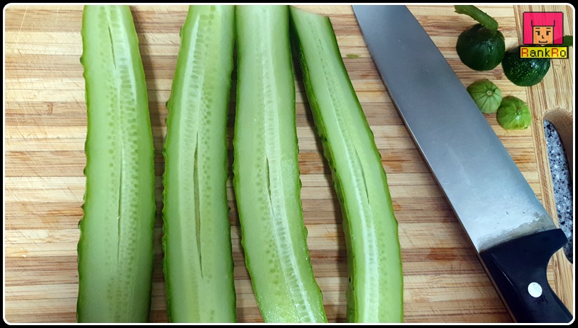 ▼ 잘 씻은 오이는 양쪽 끝부분은 자른 후 세로 방향으로 2등분으로 썰어 주세요.