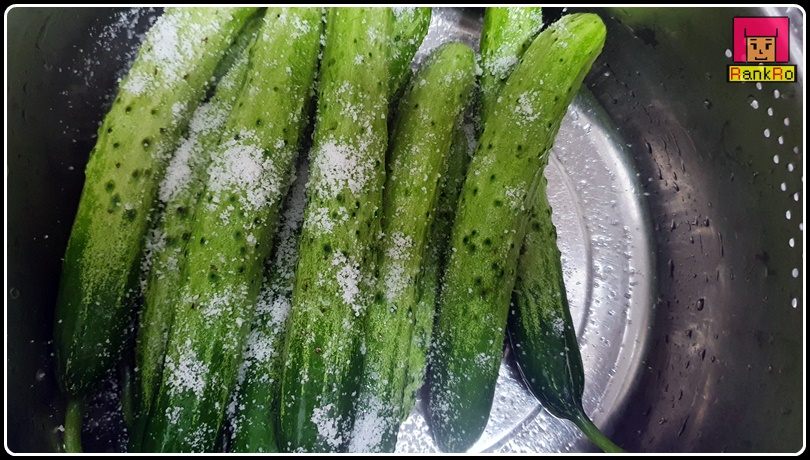 ▼ 소금은 굵은소금이나 일반 소금을 사용해 문질러 주면서 흐르는 물에 깨끗하게 세척해 주세요. 농약 제거와 껍질에서 나는 쓴맛을 제거할 수 있으니 소금으로 문질러 씻은 후 채반에서 물기를 제거해 준비합니다.