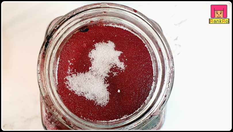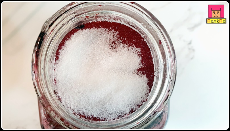 ▼ 유리병에 아로니아를 담았으면 남겨 둔 설탕 1/3을 넣어주세요. 설탕을 마지막으로 한번 더 덮는 이유는 공기와 아로니아 청이 만나면서 곰팡이가 생기는 걸 막아주는 이유입니다.