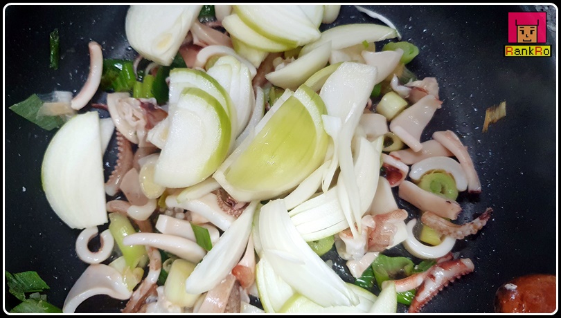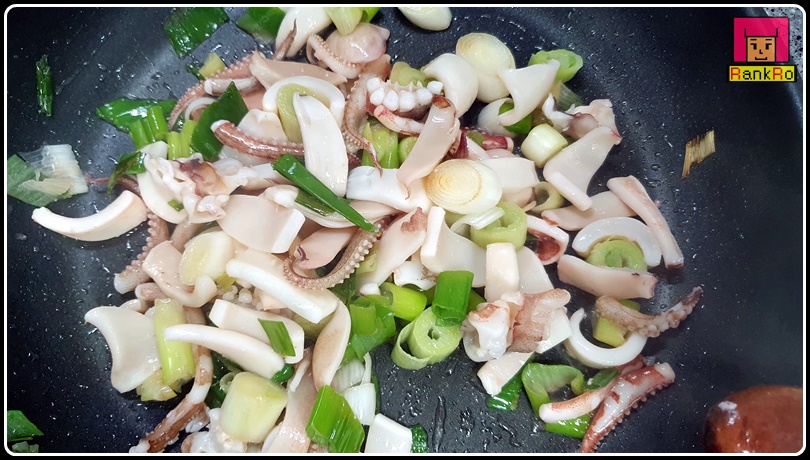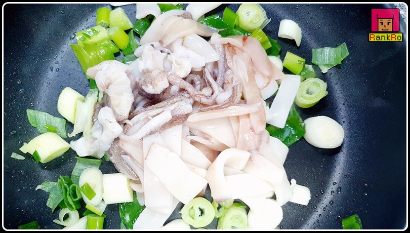 ▼ 파 기름이 만들어졌다면 썰어서 준비된 오징어를 넣어 주세요.