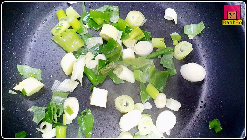 ▼ 달궈진 팬에 식용유 2큰술을 넣어 주세요. 중불에서 송송 썰어놓은 대파를 넣어 볶아 파 기름을 만들어 줍니다.
