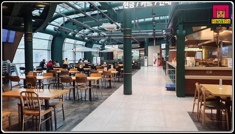 ▼ 3층 푸드코트입니다. 이른 오전 시간이라 한산한 모습의 푸드코트네요. 건물 밖에서 보는 모습과는 다르게 넓은 내부 공간으로 벽면과 천장이 환하게 창으로 되어 있어 채광이 따뜻하게 느껴지면서 시원한 느낌의 모습으로 답답함을 느낄 수 없어 좋았던 것 같아요. 뷰가 좋아 지나가는 차들의 모습도 보며 즐거운 식사시간을 갖는 것도 좋을 것 같네요.