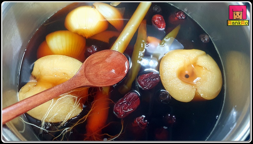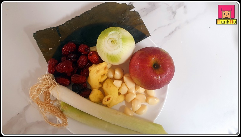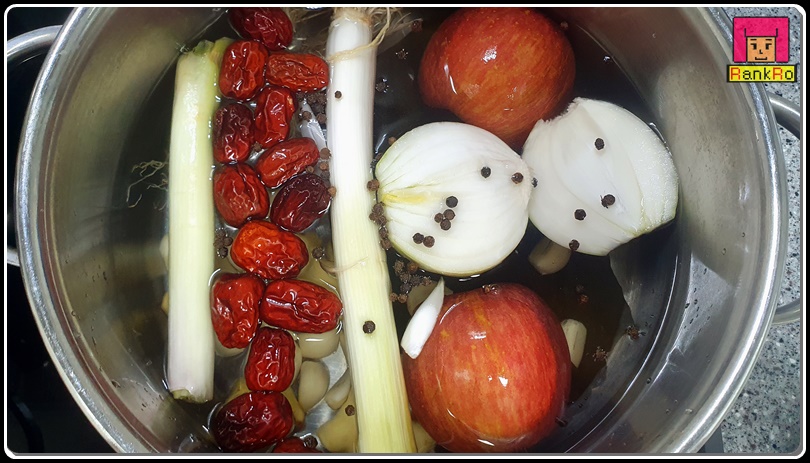 간장 달인 물 : 다시마 1개, 양파 1개, 사과 1개, 대추 10개, 생강 1개, 통마늘 15개, 통후추 1/3큰술, 대파 흰 부분과 뿌리