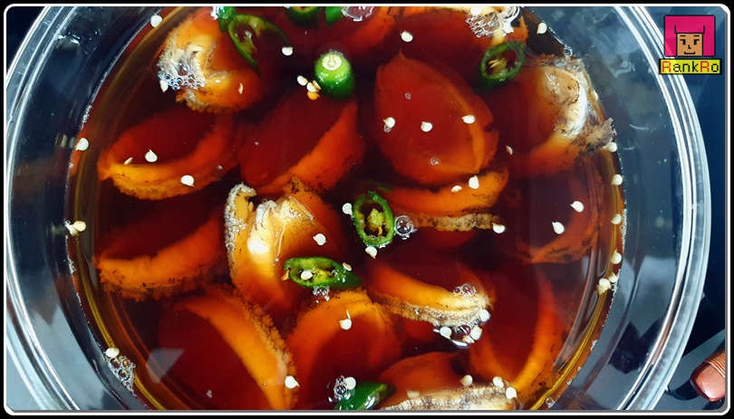▼ 전복을 담은 통에 간장 달인 물을 넣어 주세요. 전복장의 맛을 더하기 위해 청양고추를 넣어주세요. 아이들과 함께 먹을 전복장이라 맵지 않게 먹기 위해 청양고추 1개만 썰어 넣었습니다. 기호에 맞게 청양고추는 더 추가하시면 칼칼하면 부드러운 전복장을 드실 수 있습니다. 냉장고나 김치냉장고에 하루 이틀 숙성 후 맛있게 드시면 됩니다. 전복장 보관기간을 일주일 정도이니 일주일 안에 드시는 걸 추천드려요.