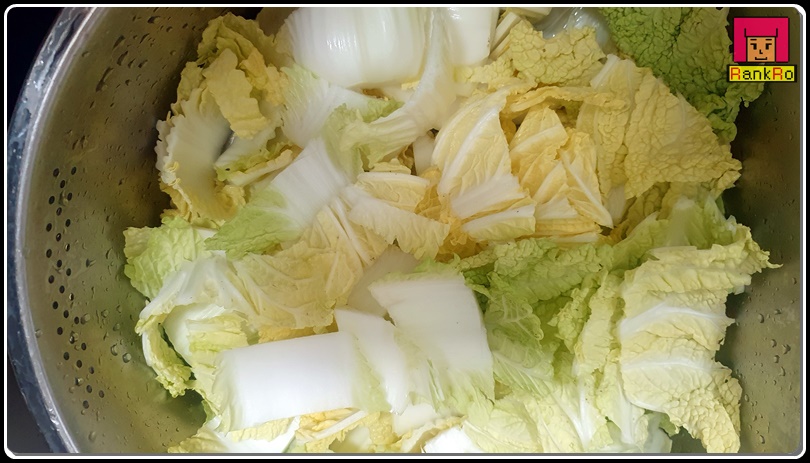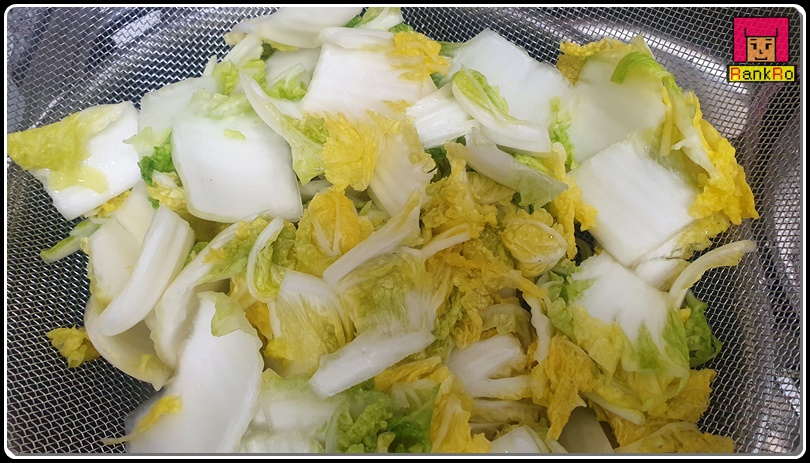 ▼ 알배기배추가 잘 절여졌다면 배추가 구부러진 모양이니 이제 찬물에 여러 번 헹궈 소금의 짠기를 빼 주세요. 짠기를 빼낸 알배기배추는 체반에 바쳐 물기를 빼 주세요