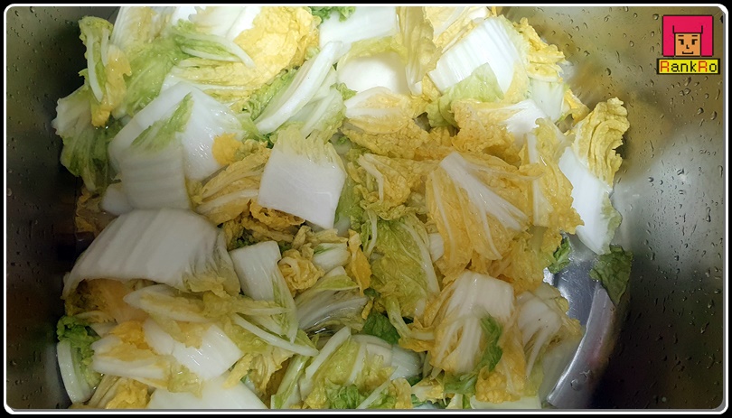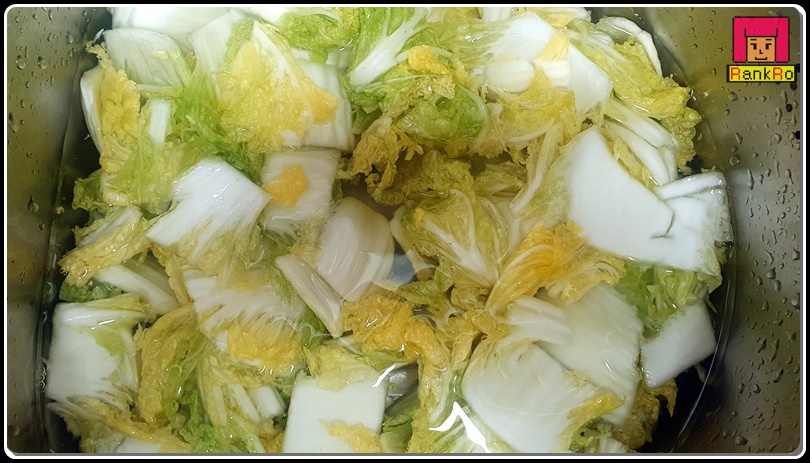 ▼ 넓은 큰 볼에 잘라서 준비한 알배기 배추를 담고 여러 번 물에 헹궈내주세요.