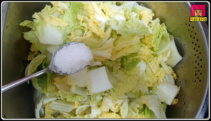▼ 배추겉절이만드는법으로 소금을 넣고 알배기배추를 30분 정도 절여 주세요. 중간에 위아래로 섞이도록 알배기배추 위치를 바꿔 주시면 됩니다.
