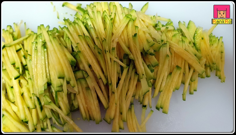▼ 슬라이스 된 애호박은 두껍지 않게 고르게 채를 썰어 주세요. 애호박 두께가 두툼하게 되면 호박전을 만들었을 때 호박이 고르게 익지 않거나 서걱거릴 수 있으니 얇게 썰어주시면 됩니다.