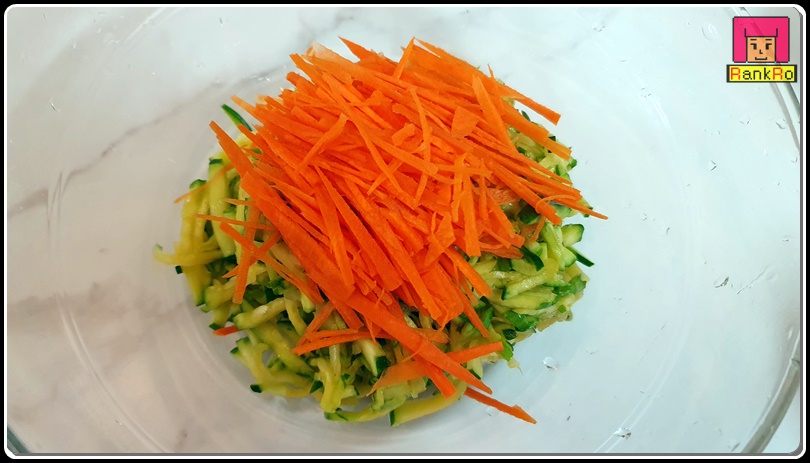 ▼ 호박전 만들기에 들어가는 애호박과 당근을 모두 채 썰어 큰 볼에 담아 준비해 주세요.