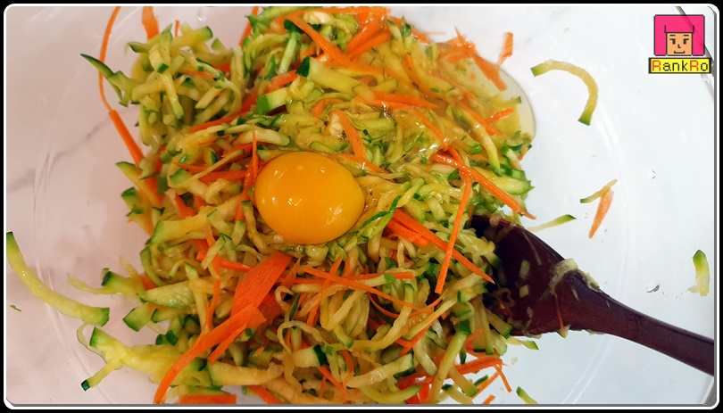 ▼ 가볍게 애호박채전에 들어간 모든 재료를 잘 섞어 주세요. 칼칼한 맛으로 고추를 썰어 넣어 주셔도 좋으니 기호에 맞게 더 많은 재료를 추가해 주셔도 좋습니다.