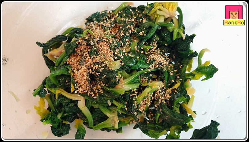 ▼ 섬초무침 , 시금치나물 양념으로 참기름이나 들기름 1큰술, 다진 마늘 1/2큰술, 국간장 1큰술을 넣어 주세요.