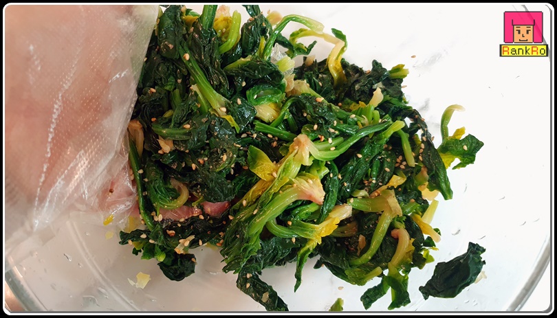 ▼ 양념을 더한 섬초무침 나물을 조물조물 슥슥 무쳐 주세요. 섬초의 단맛과 아삭함이 느껴지는 시금치무침 무치는 법으로 기호에 따라 간이 부족하다면 국간장이나 소금을 더 추가해 주세요.