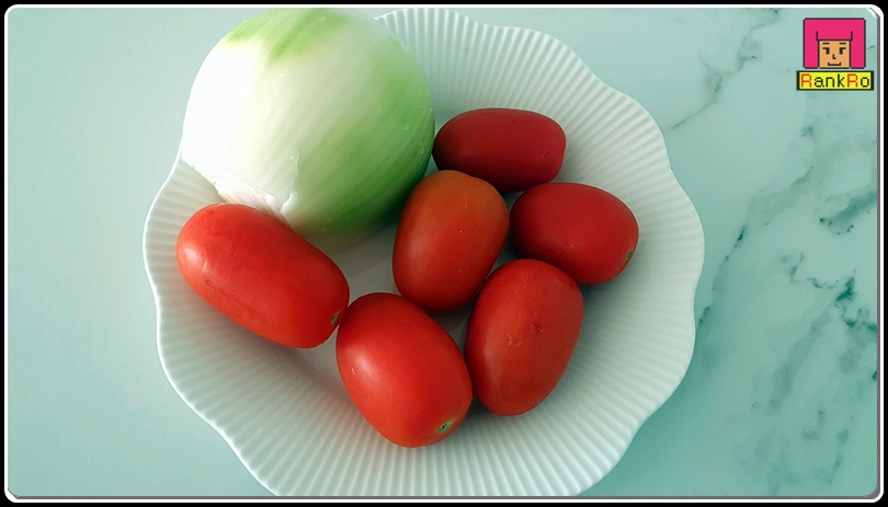 ▼ 아보카도 과카몰리 만드는 법에 들어가는 재료로 양파 1/4개, 방울토마도 6개 준비했습니다. 아보카도 과카몰리에 부담스럽지 않은 다른 부재료를 넣어 만들어 주셔도 좋습니다. 취향에 따라 양파와 토마토의 양을 조절해서 넣어 주세요.