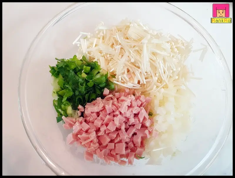 ▼ 팽이버섯 참치전에 들어가는 야채는 모두 잘라 준비해 주세요. 양파, 대파, 스팸은 잘게 다지고, 팽이버섯은 식감이 좋도록 길이감 있게 잘라 주면 됩니다. 당근이나 청양고추, 옥수수콘 등 어떤 재료를 넣어도 맛이 좋으니 다양한 야채나 재료를 추가하셔도 좋습니다.