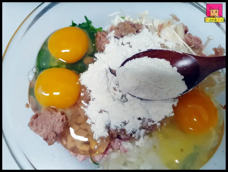 ▼ 팽이버섯요리 팽이버섯 참치전에 부침가루 3큰술을 넣어주세요. 부침가루 없이 팽이버섯 참치전을 만든다면 참치기름을 꼭 짜서 섞어 부치면 참치전 모양을 예쁘게 잡을 수 있습니다.
