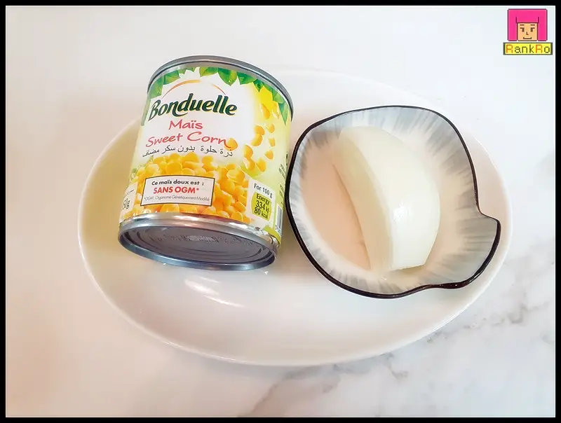 옥수수통조림 150g, 양파 1/4개, 마요네즈 3큰술, 설탕 1/2큰술, 버터 5~10g, 체다치즈 2장, 모짜렐라치즈
