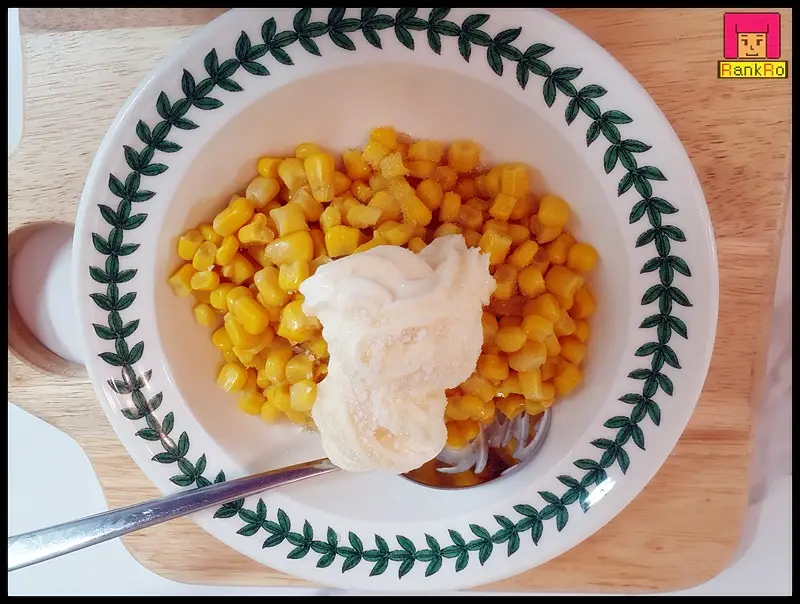 ▼ 물기를 제거한 옥수수콘은 볼에 담아 마요네즈 3큰술, 설탕 1/2큰술을 넣고 잘 섞어 준비해 주세요. 설탕을 넣으면 짭짤한 치즈와 잘 어우러져 맛있는 풍미를 높여줄 수 있습니다.