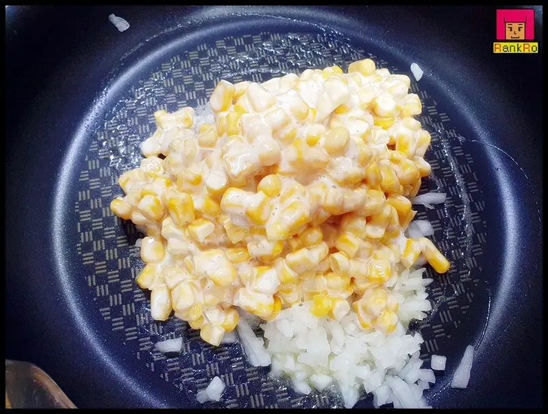 ▼ 양파와 함께 마요네즈에 버무린 옥수수콘을 넣어 주세요.