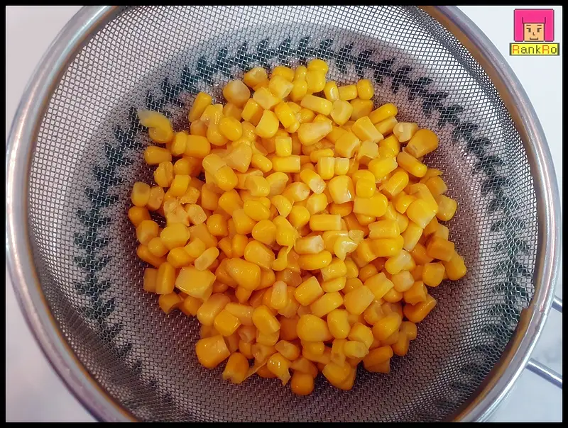 ▼ 콘치즈만드는법에 들어가는 옥수수통조림은 채반에 담아 물기를 제거해 준비해 주세요. 콘치즈만드는법에 옥수수통조림 국물이 들어가게 되면 국물이 가득한 콘치즈레시피 수프가 만들어 질 수 있으니 물기를 꼭 제거해 주시면 됩니다.