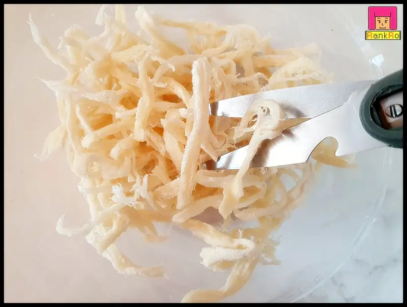 ▼ 오징어채무침은 너무 길면 먹기 불편하니 가위를 이용해 먹기 좋은 크기로 잘라 준비해 주세요. 조금 딱딱해진 진미채라면 따뜻한 물에 살짝 담갔다가 물기를 제거한 후 요리하면 부드러운 맛으로 즐길 수 있습니다.