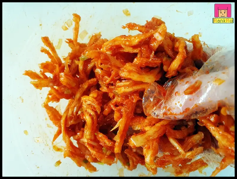 ▼ 오징어채무침에 들어가는 매콤달콤한 양념장을 넣어 주세요.