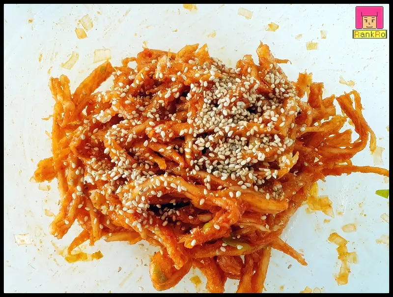 ▼ 마지막으로 깨소금을 넣어주면 맛깔스럽게 만들어 낸 고추장 진미채무침이 완성입니다. 입맛 없을 때 입맛 살리는 밑반찬이나 간단하게 맥주안주로 즐겨도 좋은 오징어채무침으로 만들어 맛있게 드셔보세요.