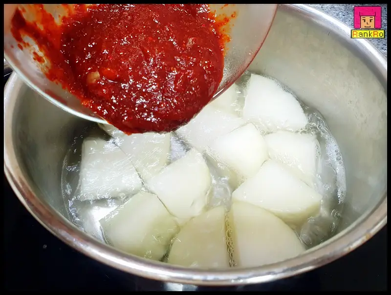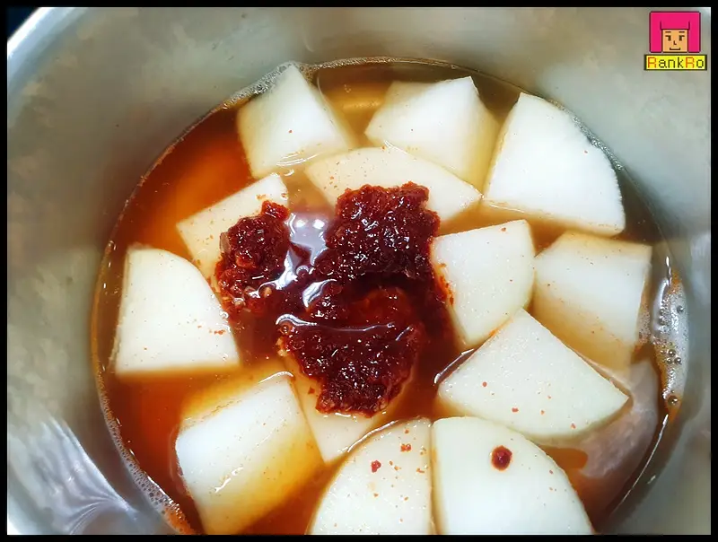 ▼ 보글보글 물이 끓어오르면 준비된 무조림레시피 양념장을 넣어 주세요.