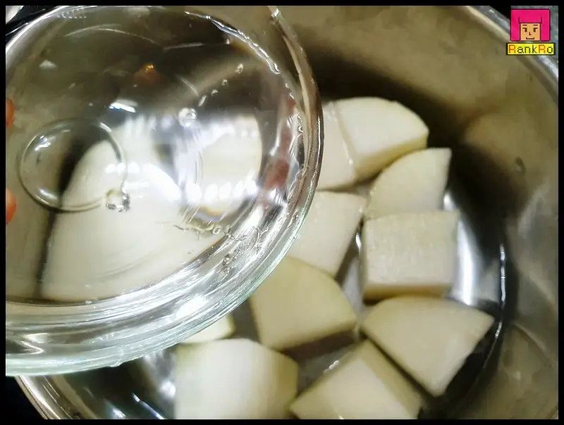 ▼ 냄비에 무를 깔고 물 500~550ml 넣어 강불에 끓여주세요. 물은 종이컵기준 3컵을 넣어 주시면 됩니다. 냄비 사이즈에 따라 물의 양이 달라질 수 있습니다.