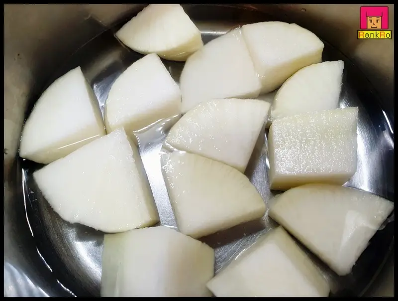 ▼ 무조림에 들어가는 재료 준비가 다 되었다면 맛있게 조려낼 냄비에 썰어둔 무를 넣어 주세요.