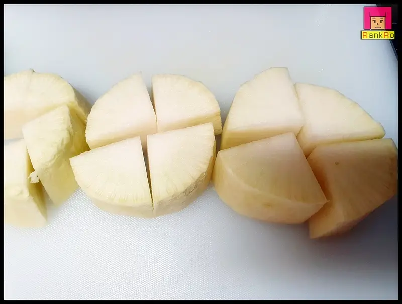 ▼ 무는 껍질을 제거해 십자모양으로 4등분으로 도톰하게 먹기 좋게 잘라 준비해 주세요. 대파도 어슷 썰기로 썰어 준비합니다.