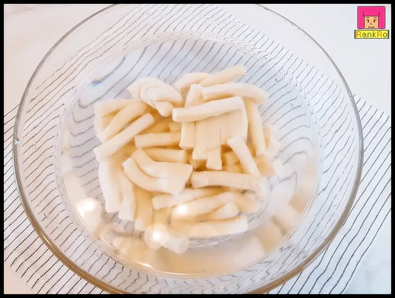 ▼ 간장떡볶이에 들어가는 떡볶이떡을 준비해 주세요. 냉장 떡볶이 떡은 흐르는 물에 가볍게 씻어 찬물에 담가 준비해 주시면 됩니다. 저는 냉동고에 있던 떡볶이 밀떡이라 찬물에 담가 해동했습니다. 쌀떡이나 밀떡 취향에 따라 준비해 궁중떡볶이를 만드시면 됩니다.