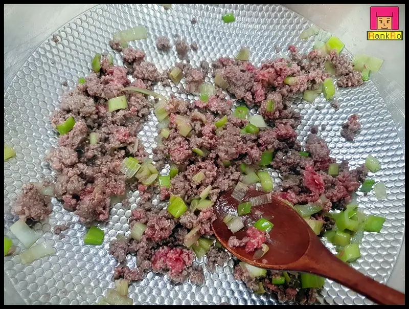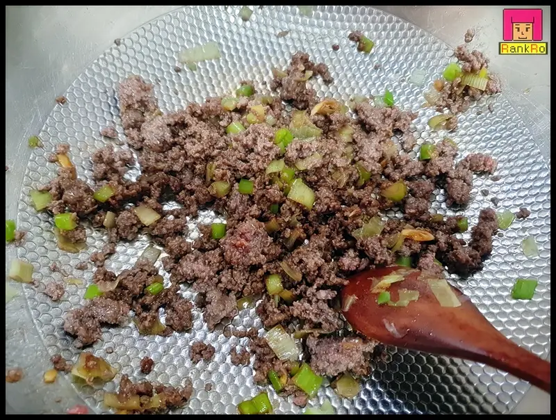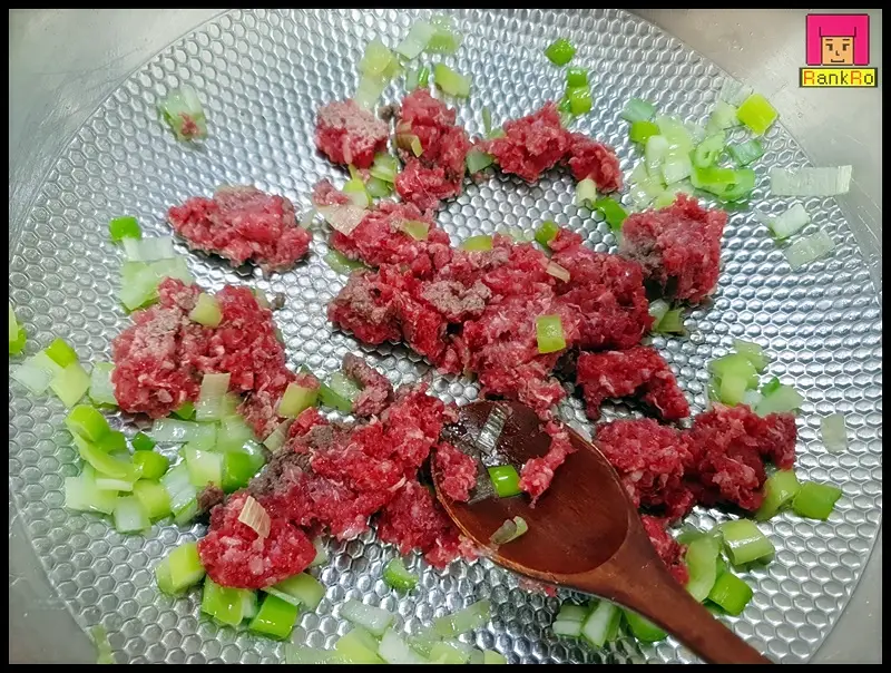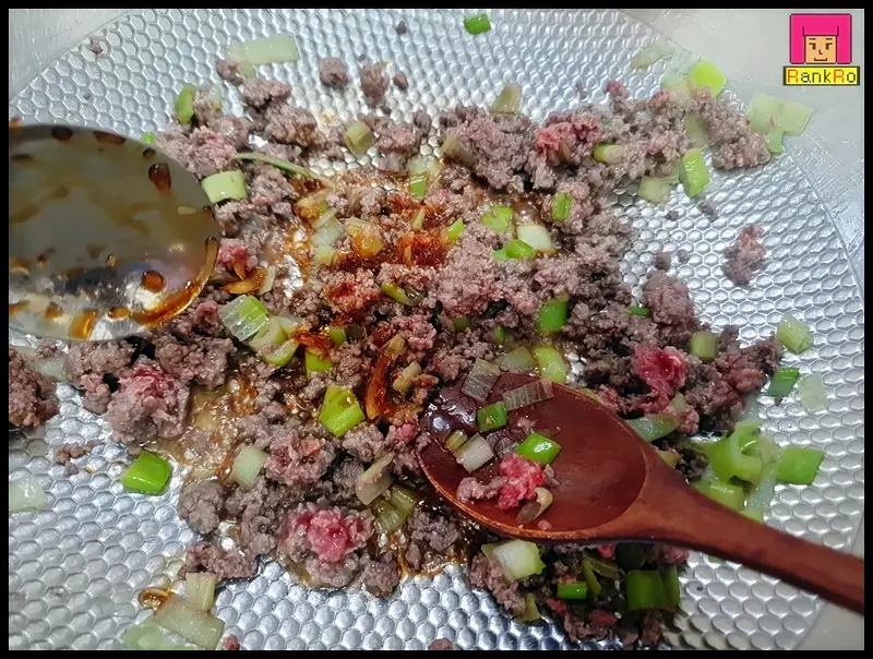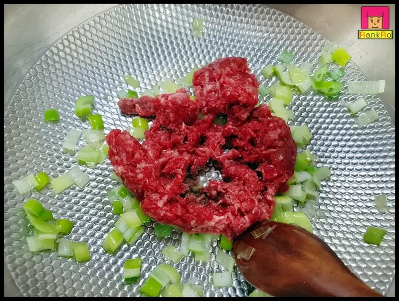 ▼ 대파향이 솔솔 올라오면 준비해 놓은 소고기 다짐육을 넣고 중강불에 볶아 주세요.