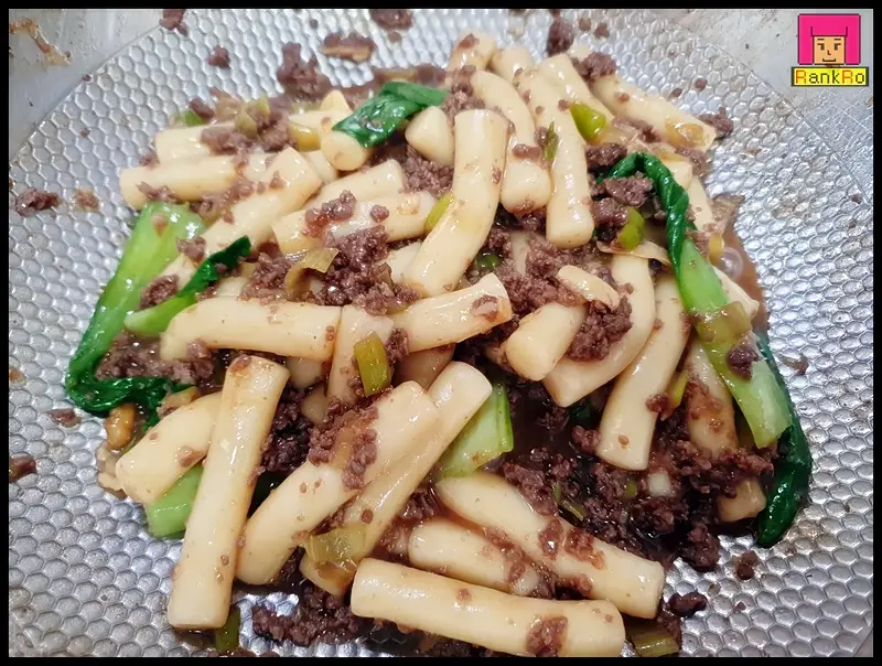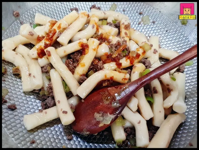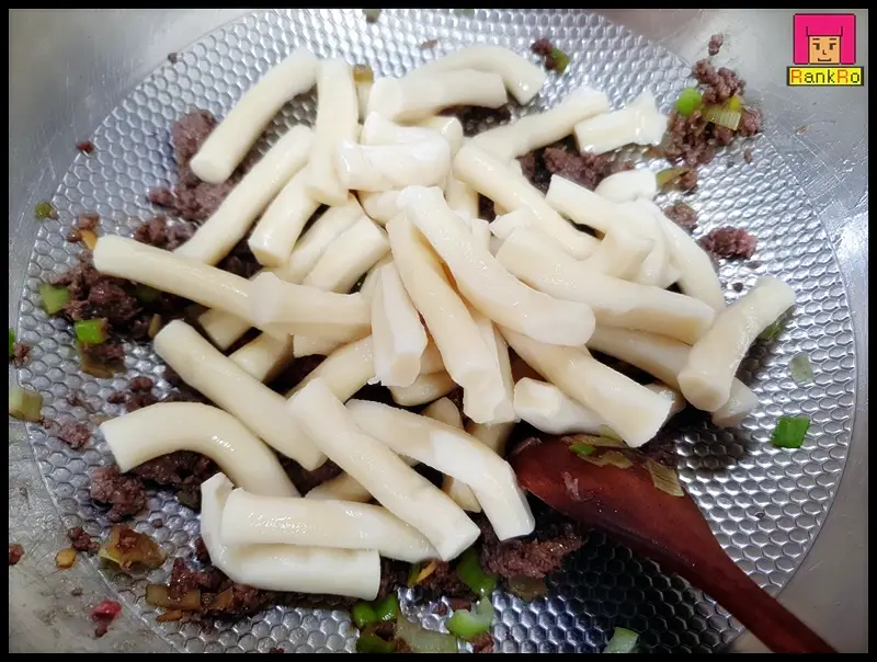 ▼ 간장양념장과 떡볶이 떡, 소고기다짐육이 잘 어우러지도록 강불에 볶아주세요.