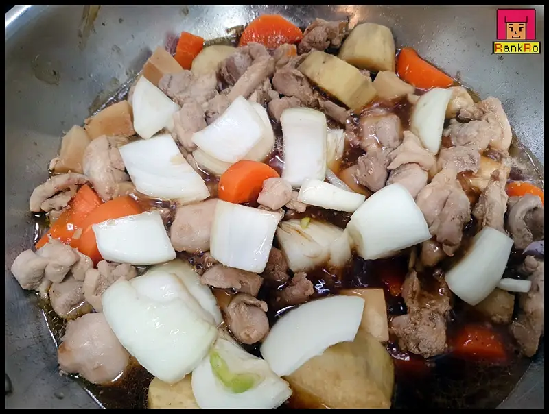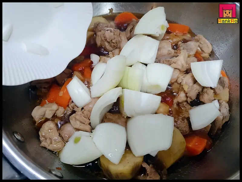 ▼ 닭다리살 닭정육이 다 익었다면 준비해 놓은 양파를 넣어 한번 더 끓여 내주세요.