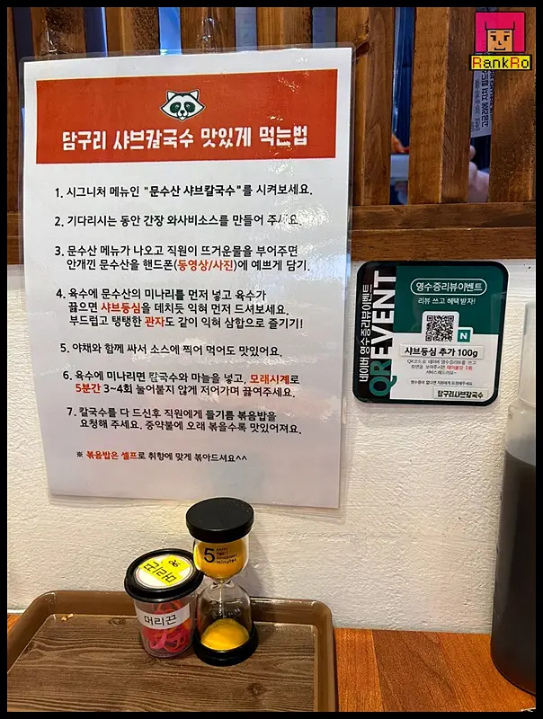 ▼ 각 테이블마다 담구리 샤브 칼국수를 맛있게 먹는법이 안내되어 있었어요. 김포 가볼 만한 곳으로 문수산과 대명항을 모티브로 만든 시그니처 메뉴 문수산 샤브 칼국수는 담구리의 대표메뉴로 먹는 방법이 자세하게 안내되어 있으며 영수증리뷰이벤트도 진행하고 있으니 참여해 보셔도 좋을 것 같네요. 사장님의 세심한 배려가 눈에 띄는 머리끈도 준비되어 있으며 칼국수를 끓일 때 사용하는 모래시계도 있어 칼국수를 알맞게 끓일 수 있었습니다.