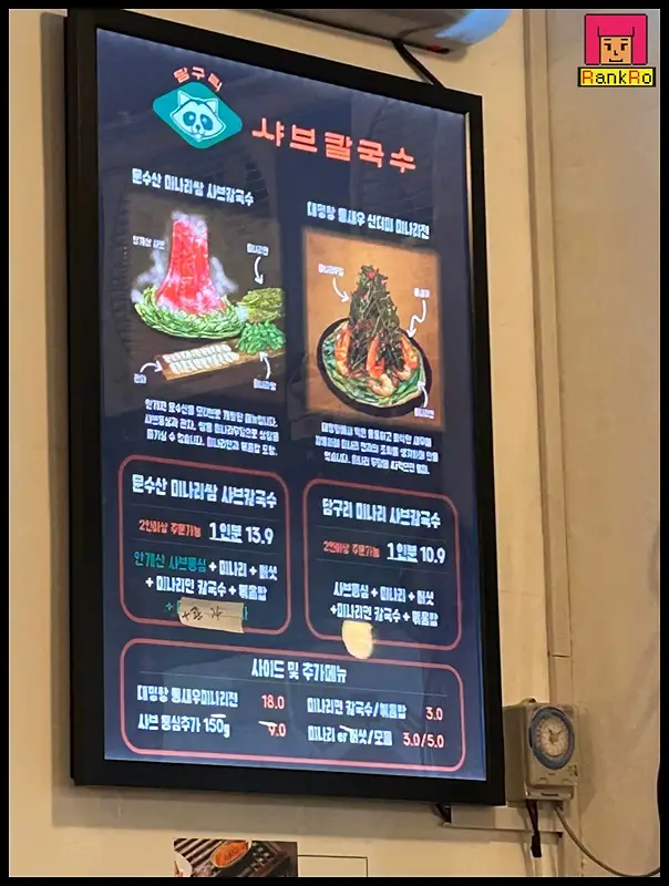 ▼ 김포 장기동맛집 담구리샤브는 매장 안 키오스크를 통해 주문을 할 수 있습니다. 저는 담구리샤브 시그니처 메뉴로 문수산 미나리 샤브칼국수를 주문했습니다. 색다른 메뉴인 담구리 문수산 샤브 칼국수에는 안개산 샤브등심과 미나리, 관자, 버섯, 미나리면칼국수, 볶음밥, 을 한 번에 즐길 수 있는 메뉴입니다.