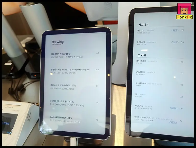 ▼ 상두그레이 원두는 입안에서 느껴지는 와인 같은 약한 산미와 초콜릿과 견과류 같은 고소한 향미의 원두인 회색, 은은하게 나는 과일톤의 산미와 약간의 단맛의 원두 매화로 원두 선택이 가능하며 판매도 하기 때문에 커피 향을 맡아볼 수 있게 되어 있어요. 저는 개인적으로 입안에서 느껴지는 산미가 있는 원두를 좋아하지 않아 익숙한 맛의 회색으로 선택해 마셨어요.