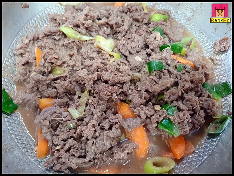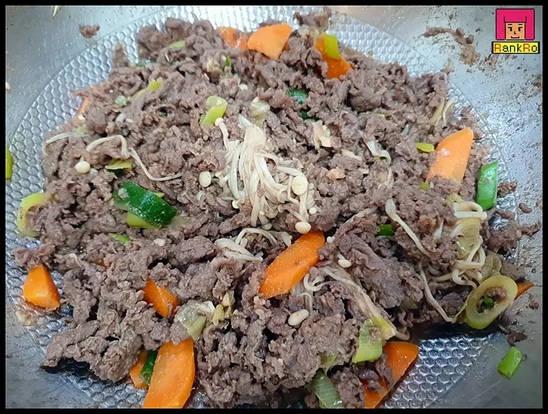 ▼ 볶다 보면 고기와 야채에서 수분이 나와 소불고기 국물이 생겨나니 센 불에서 조리해 주세요.