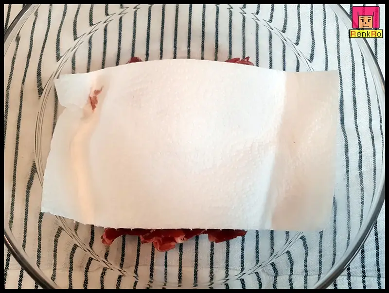 ▼ 소불고기의 누린내를 제거하기 위해 핏물을 제거합니다. 핏물을 제거하기 위해서는 물에 담가 핏물을 빼거나 키친타월을 이용해 핏물제거를 하면 됩니다. 핏물 제거 후에는 불고기감이 뭉치지 않게 풀어 준비해 주세요.