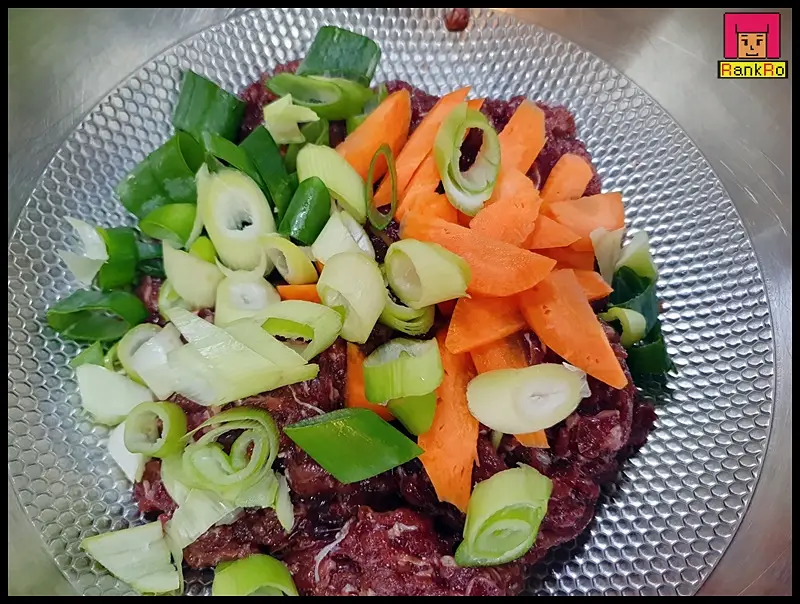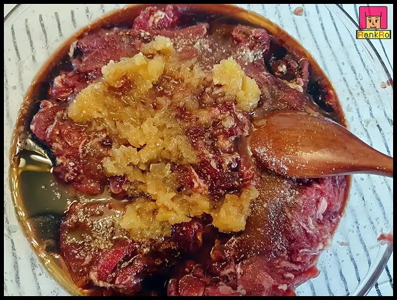 ▼ 핏물을 제거한 불고기에 갈아놓은 배와 양파를 넣어 주세요.