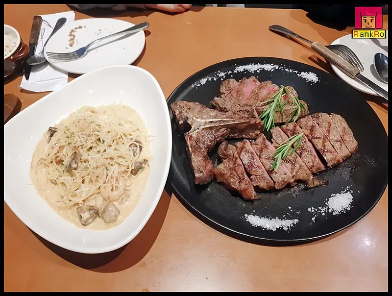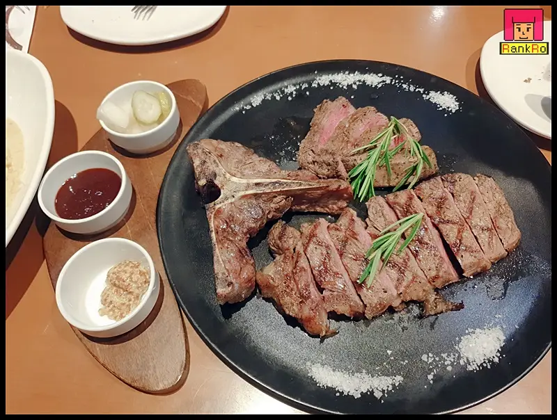 ▼ 아웃백 티본스테이크 티본은 T자 모양을 한 스테이크이며 뼈 양옆으로 채끝등심과 안심이 붙어있는 부위입니다. 스테이크와 함께 하기 좋은 소스도 함께 제공되며 아웃백 스테이크 고기의 질이 좋다 보니 소금만 찍어 먹어도 맛있었어요.