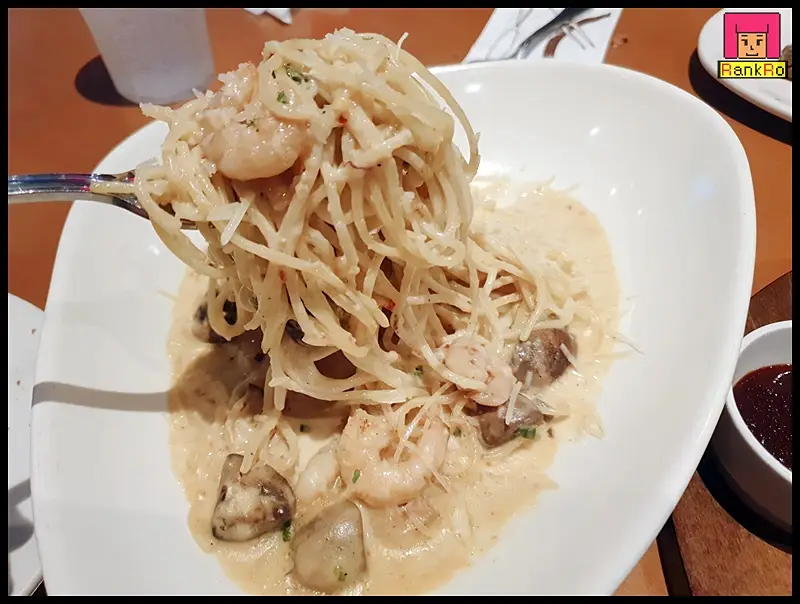 ▼ 아웃백 메뉴추천 중 인기 많은 투움바파스타입니다. 새우, 양송이, 파마산치즈가 들어간 크림 투움바파스타이며 스파게티면으로 변경하고 소스는 조금 넉넉하게 주문했어요.