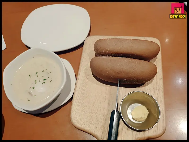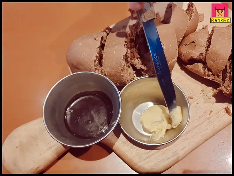 ▼ 아웃백 퍼펙트 본인스테이크 에디션 중 아웃백 포터하우스 스테이크 주문과 함께 따뜻한 수프와 식전빵 부시맨 브레드가 나왔어요. 따뜻한 빵 위에 망고스프레드와 따로 주문한 초코시럽을 발라 먹었어요.