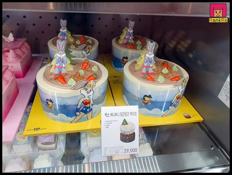 ▼ 깜찍한 모양의 벅스 버니버니 당근당근 케이크입니다. 4가지 종류의 맛으로 케이크 맨 하단은 초콜릿이며 중앙에는 쿠키앤크림 케이크 속은 벅스버니버니당근당근, 멜론의 조합인 베스킨라빈스 케이크입니다.