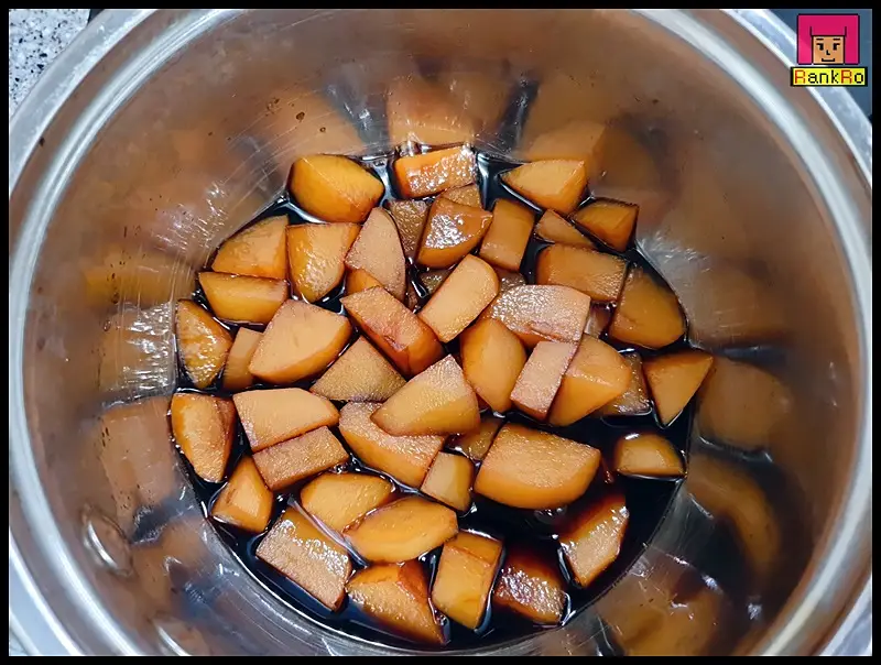 ▼ 강불에 감자조림이 끓어오르면 중 약불에 줄여 감자조림을 만들어 주세요. 감자가 으스러질 수 있으니 스푼으로 뒤적거리지 않고 냄비를 살짝 흔들어 섞어 주면 됩니다.