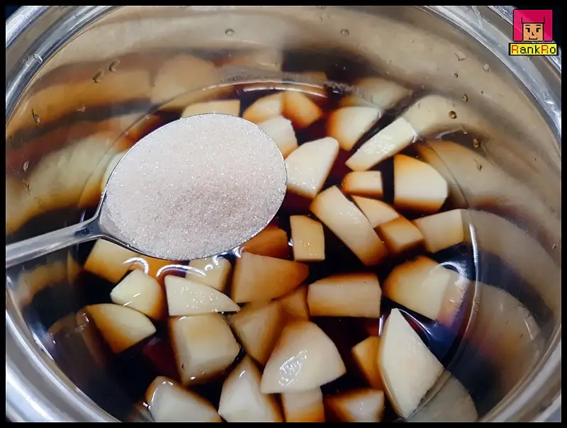 ▼ 감자조림 만드는법에 간장과 함께 설탕 2큰술, 올리고당 1큰술을 넣어 주세요. 단맛은 기호에 맞게 조절합니다.