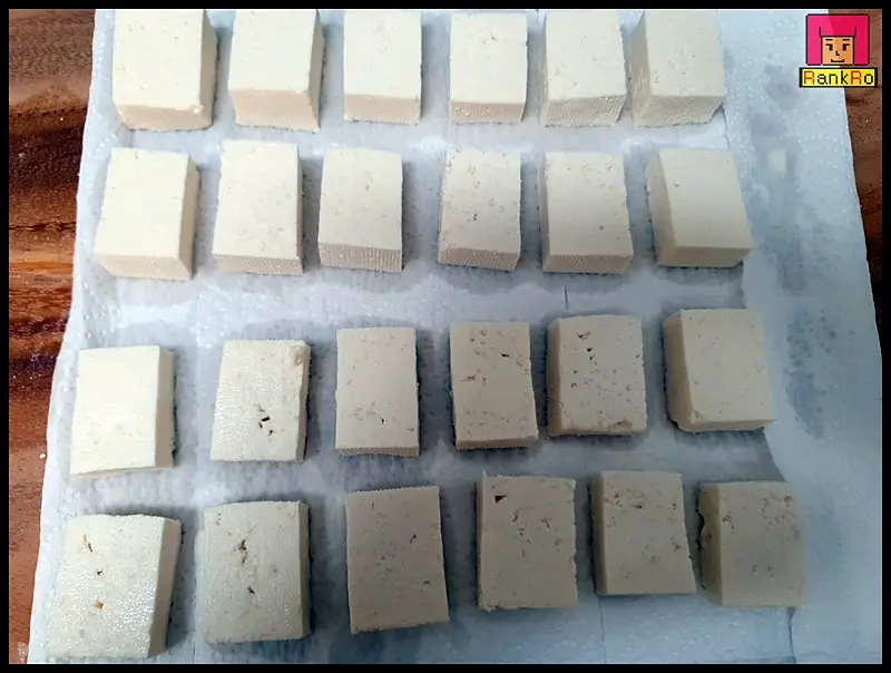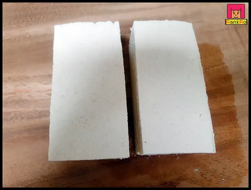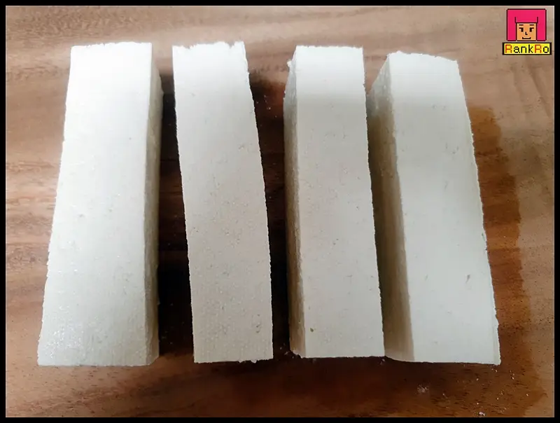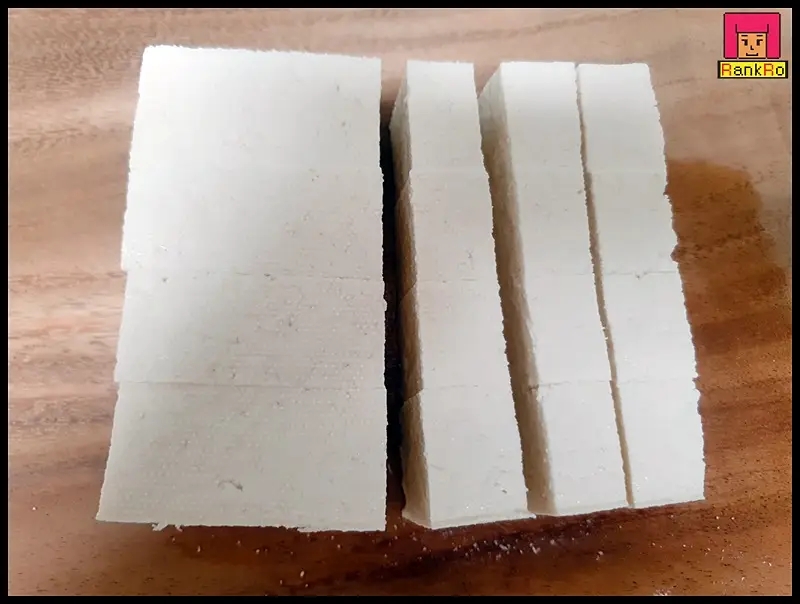 ▼ 두부 한모를 절반으로 자른 다음 기호에 맞게 먹기 좋은 크기로 잘라 주세요. 두부부침 두부는 크기가 커도 작아도 상관없으니 먹기 좋은 크기로 준비합니다. 저는 아이들과 함께 먹는 두부전이라 사이즈는 작게 잘라 준비했어요.