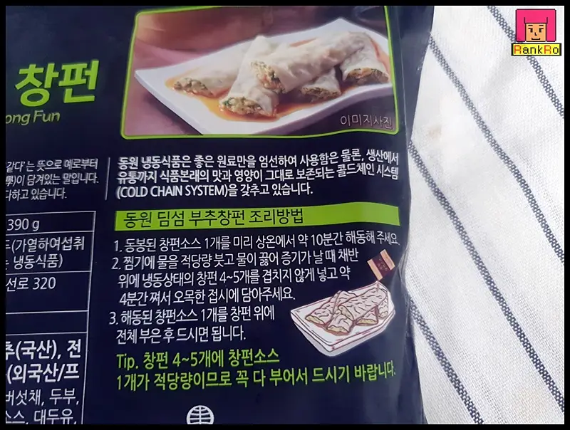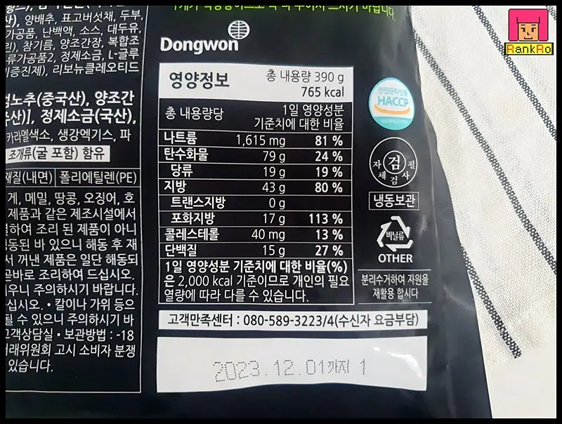 ▼ 냉동만두요리 동원 부추창펀 칼로리는 한 봉지 390g이며 760 kcal입니다.