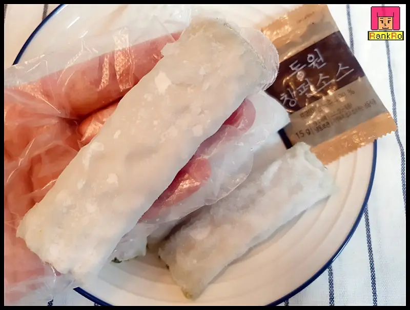 ▼ 냉동만두와는 달리 동원 부추창펀은 딤섬소를 긴 얇은 만두피에 속재료를 넣어 돌돌 말아 뚝 뚝 잘라놓은 모양입니다. 만두찜기에 부추창펀을 올리기 전 창펀소스는 꺼내 실온이나 물에 담가 해동합니다.